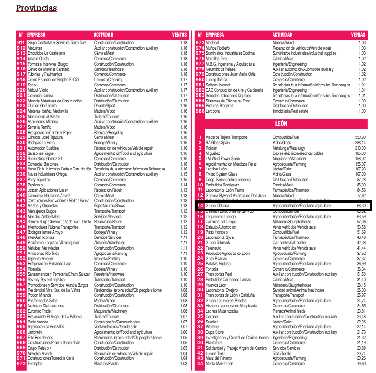 Grupo Oblanca se posiciona dentro del TOP 15 de empresas con mayor facturación de la provincia de León y en el TOP 100 de Castilla y León, según el ranking de empresas publicado por la revista Castilla y León Económica en su número de Febrero 2019.