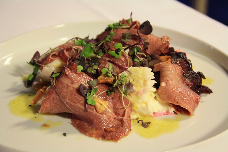 ● Ensalada de lengua de vacuno Garlaiz, remolacha a la plancha, queso mozzarella y ajos fritos