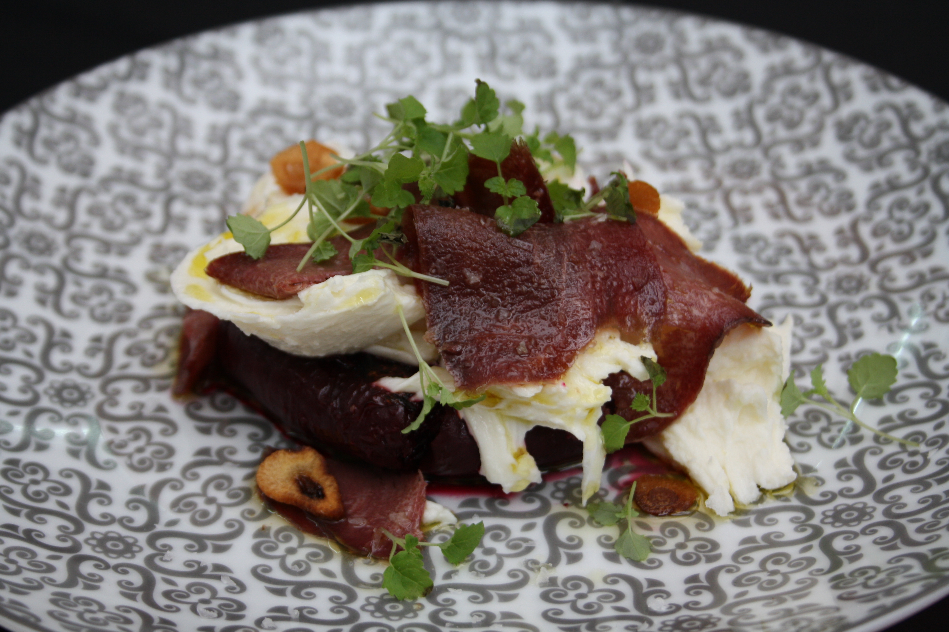 ● Ensalada de lengua de vacuno Garlaiz, remolacha a la plancha, queso mozzarella y ajos fritos