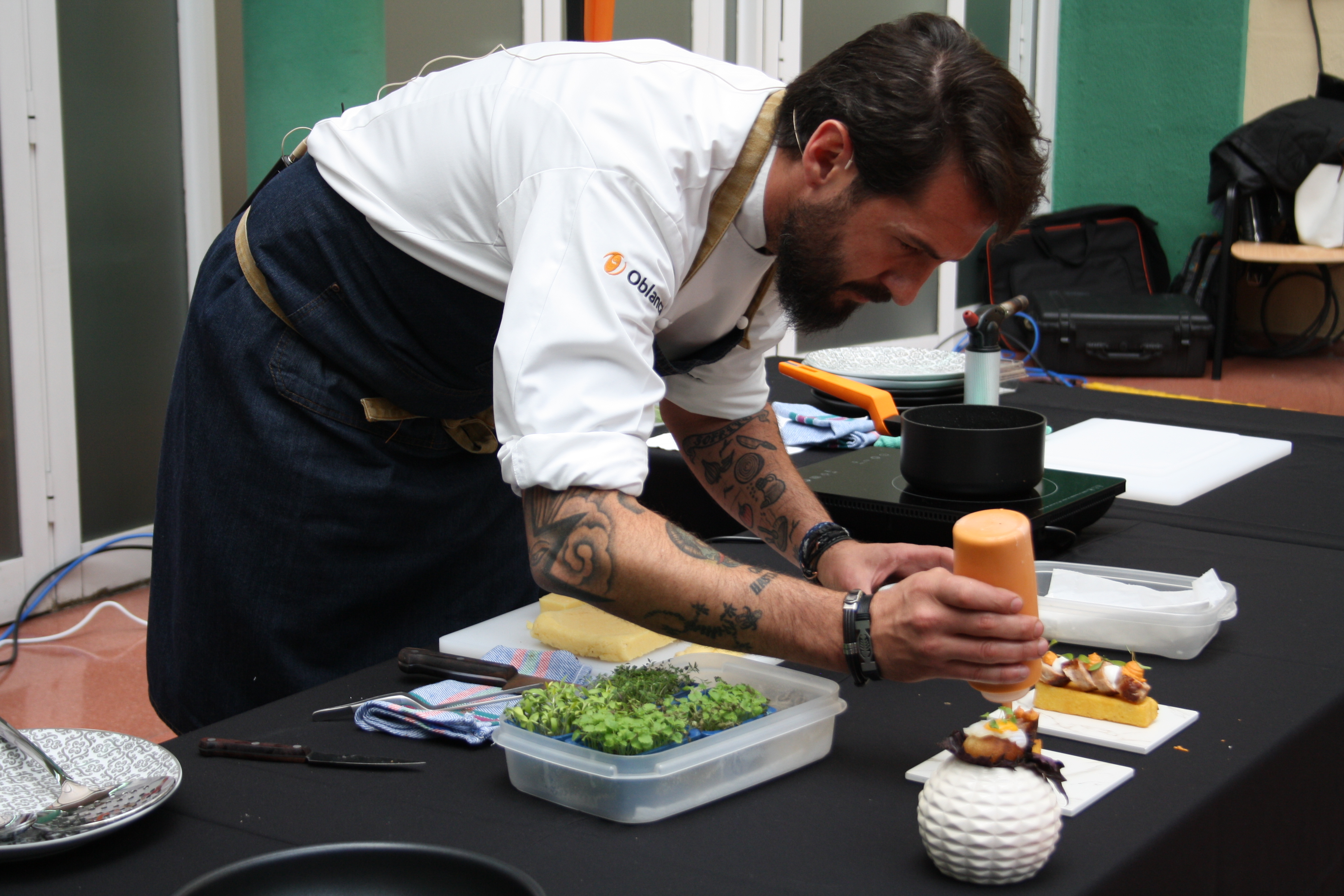 Los profesionales de hostelería asturianos, entre los que había representantes tanto de hoteles, como de restaurantes y empresas de catering, recibieron una clase magistral sobre las últimas tendencias en técnicas culinarias. El Chef Javier G. Peña, propietario de dos restaurantes en Valladolid, elaboró un menú muy original y completo, cuyos ingredientes protagonistas fueron productos de las tres marcas principales que comercializa Grupo Oblanca: OBLANCA, GARLAIZ y TOPGEL.